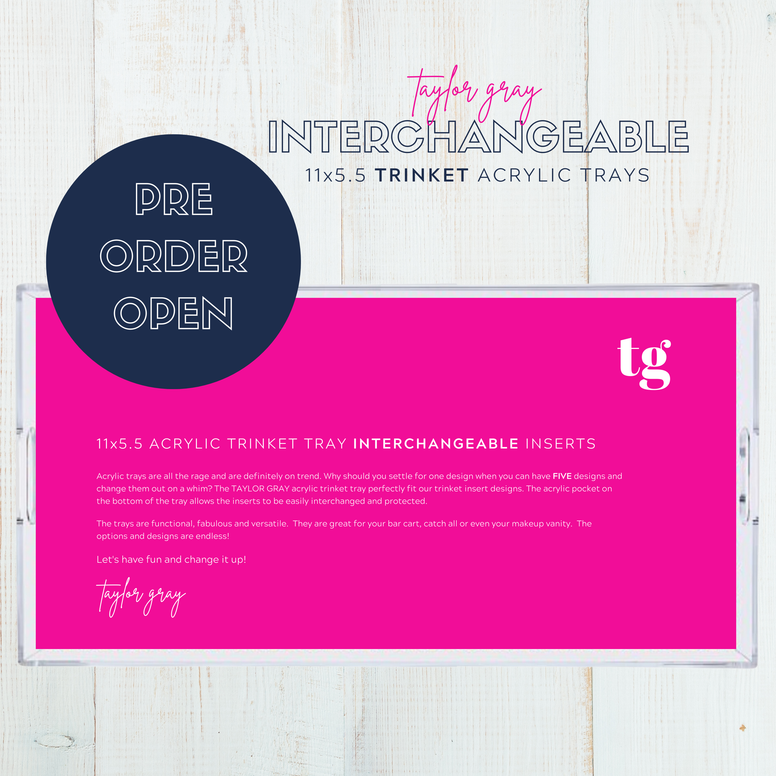 ***PRE-ORDER for OCTOBER 20th*** This listing is for a blank trinket tray with the protective pocket to slide in your insert sets. **The TAYLOR GRAY acrylic TRINKET TRAY is a 11x5.5 tray that perfectly fit our TRINKET insert designs. The patent pending pocket on the bottom of the tray allows the inserts to be easily interchanged and protected. Acrylic trays are all the rage and are definitely on trend. Why should you settle for one design when you can have FIVE designs and change them out on a whim?