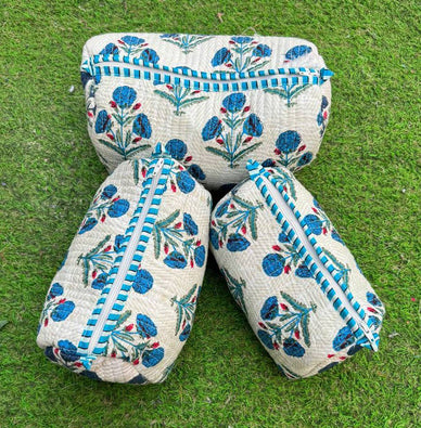 These toiletry bags are a perfect trio for your travel routine and organization. Featuring a hand-printed block print set against quilted stitching, these adorable bags are eye-catching and perfect for any on-the-go lifestyle. Grab one or purchase the whole trio of different sizes and travel in style. These bags are made by a woman-owned store that I order them from. Details: - Features a durable zipper closure to keep your items secure - Fully lined with a waterproof lining to protect against any spills or leaks Measurements: - Large : 10" (Length) x 4.7" (Width) x 5.5" (Height) - Medium: 8.3" (Length) x 3.9" (Width) x 4.3" (Height) - Small : 7.5" (Length) x 3.5" (Width) x 3.9" (Height) If you have any questions, please feel free to ask! I hope you shop with us :) Thank you!