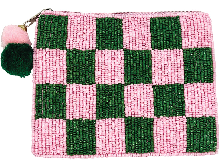 GREEN & PINK CHECKERED BEADED COIN POUCH